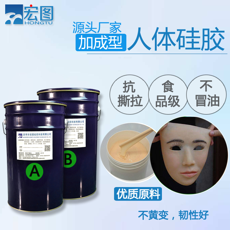 人體硅膠是一種加成型雙組份液體硅橡膠,無毒無味安全環(huán)保,硫化后會成為柔軟的彈性材料。 人體硅膠分AB雙組份,A組分硅膠,B組分固化劑,A:B一般為1:1。該產(chǎn)品既能室溫固化,也可以加溫固化,顏色為無色或皮膚色,其它顏色需聯(lián)系我司進行特調(diào)。